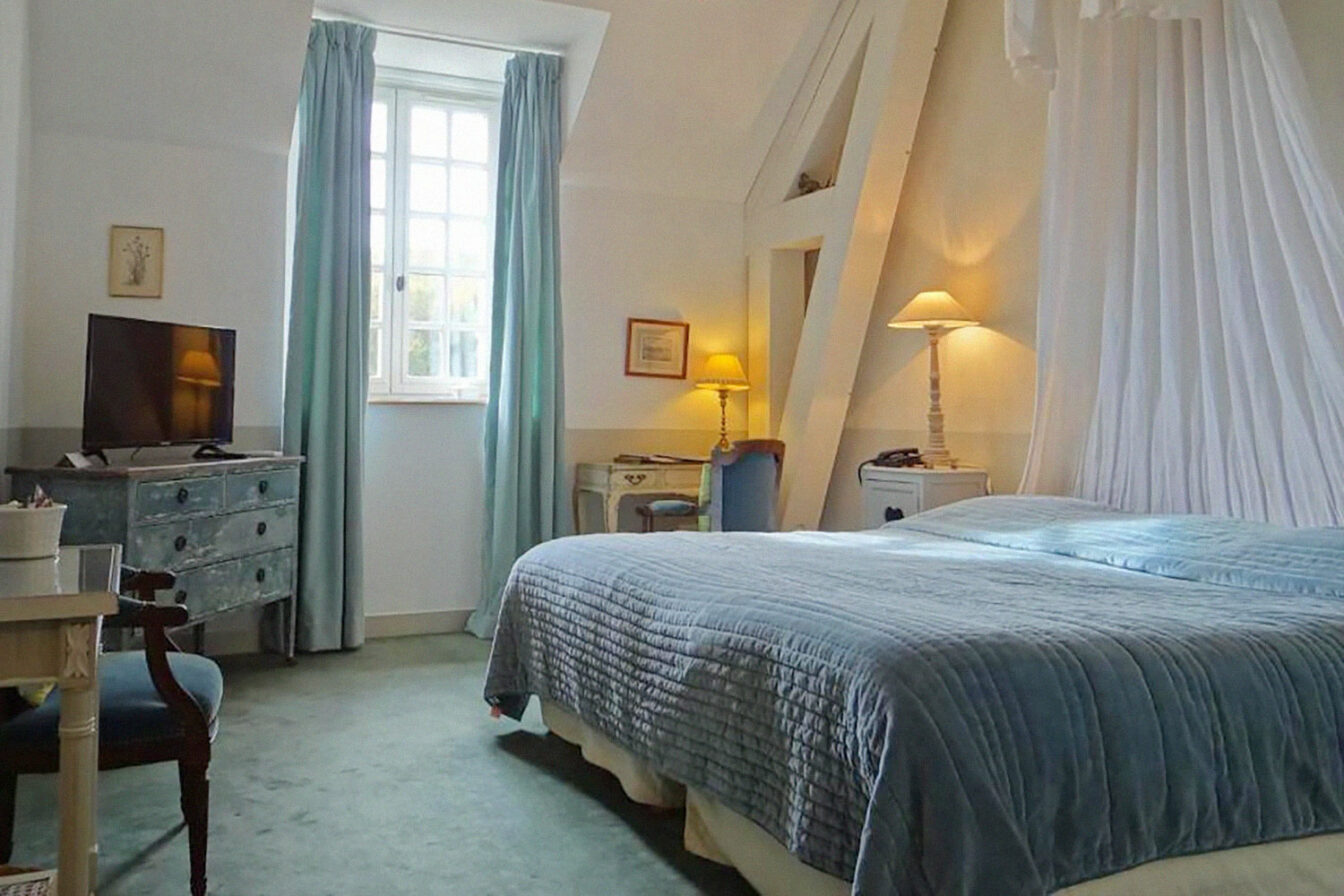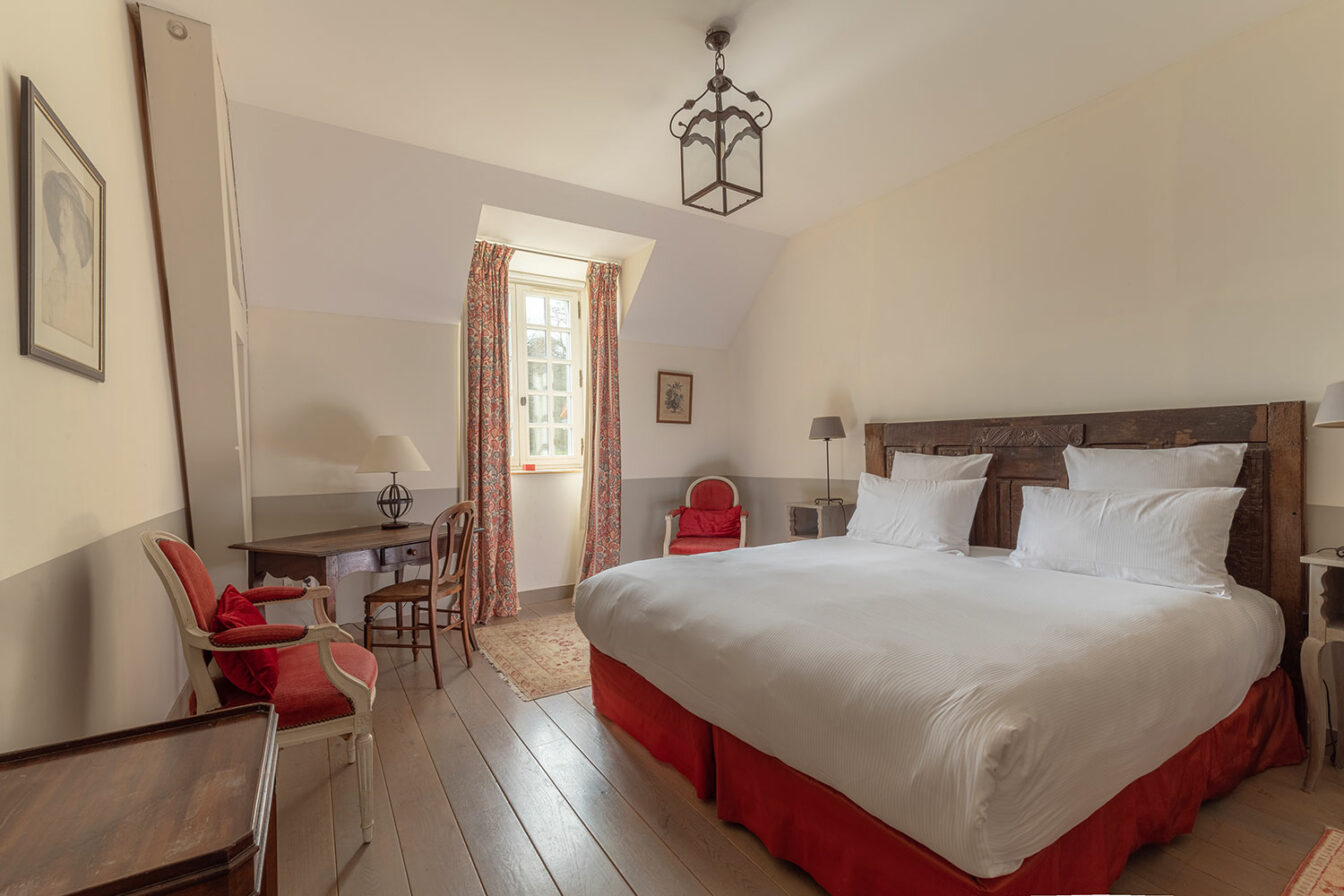 Vous séjournerez ici dans une chambre intime au mobilier authentique, où boiseries et voilages font tout autant partie du décor que le château et son parc, visibles par la fenêtre.