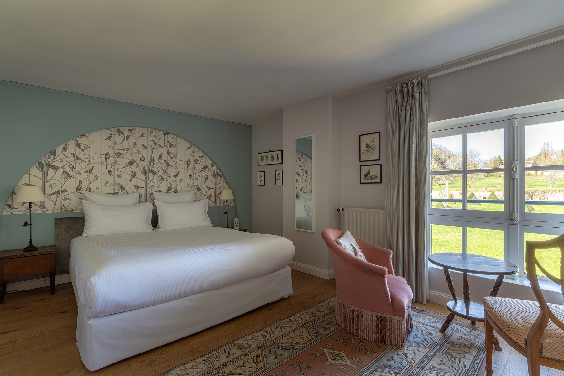 Chambre “Garde” dans l’ancienne tour de garde, chambre “Comte” et ses fastes : leur vue imprenable sur les jardins, les bassins et les fontaines vous plonge immédiatement dans l’ambiance d’Étoges, pour vivre l’expérience de la vie au château que nous nous attachons à transmettre.