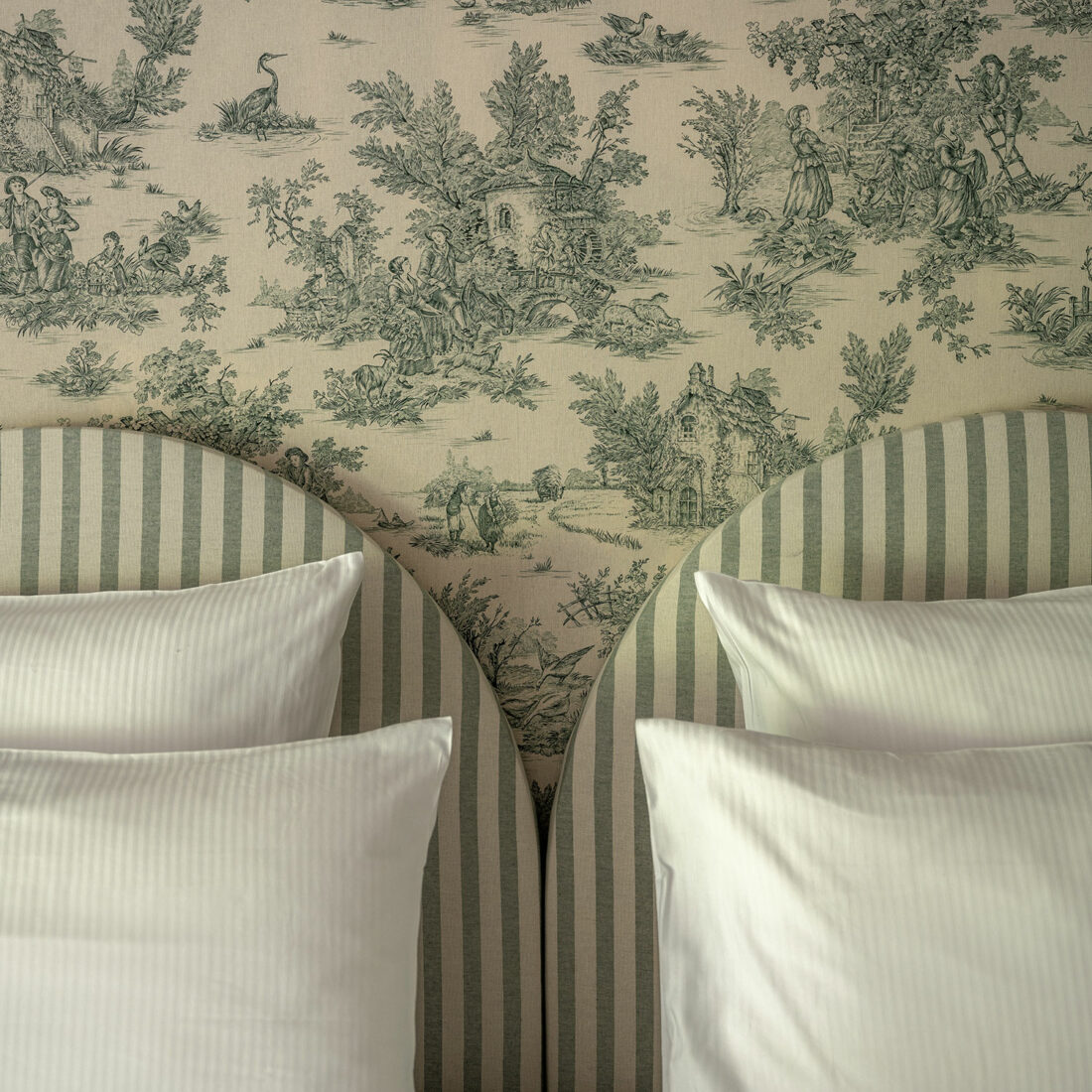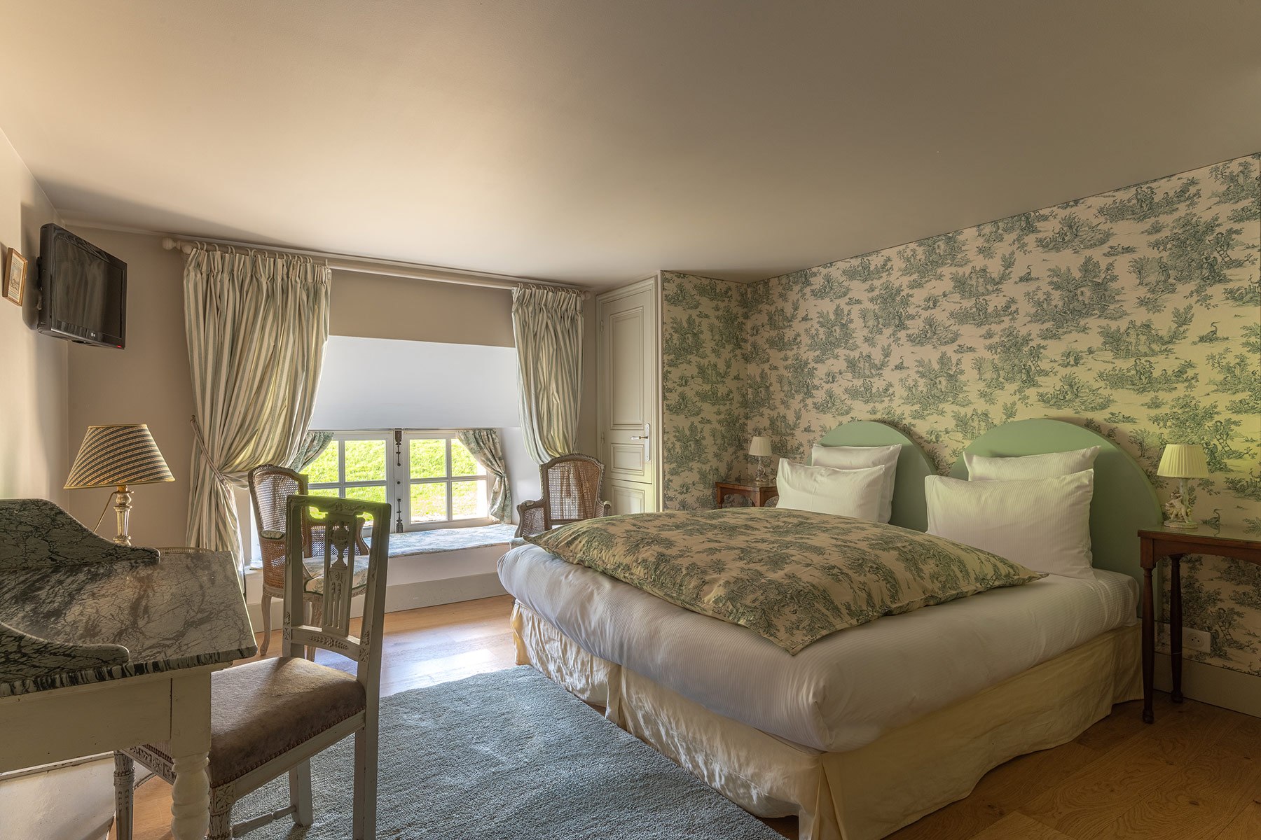 Couleurs à l’honneur, ces chambres sont de petites sucreries acidulées et suaves, une invitation à vous recentrer, à l’abri du tumulte. On peut y prendre le temps d'une lecture sur leur banc de fenêtre, vue sur les douves et les bassins.