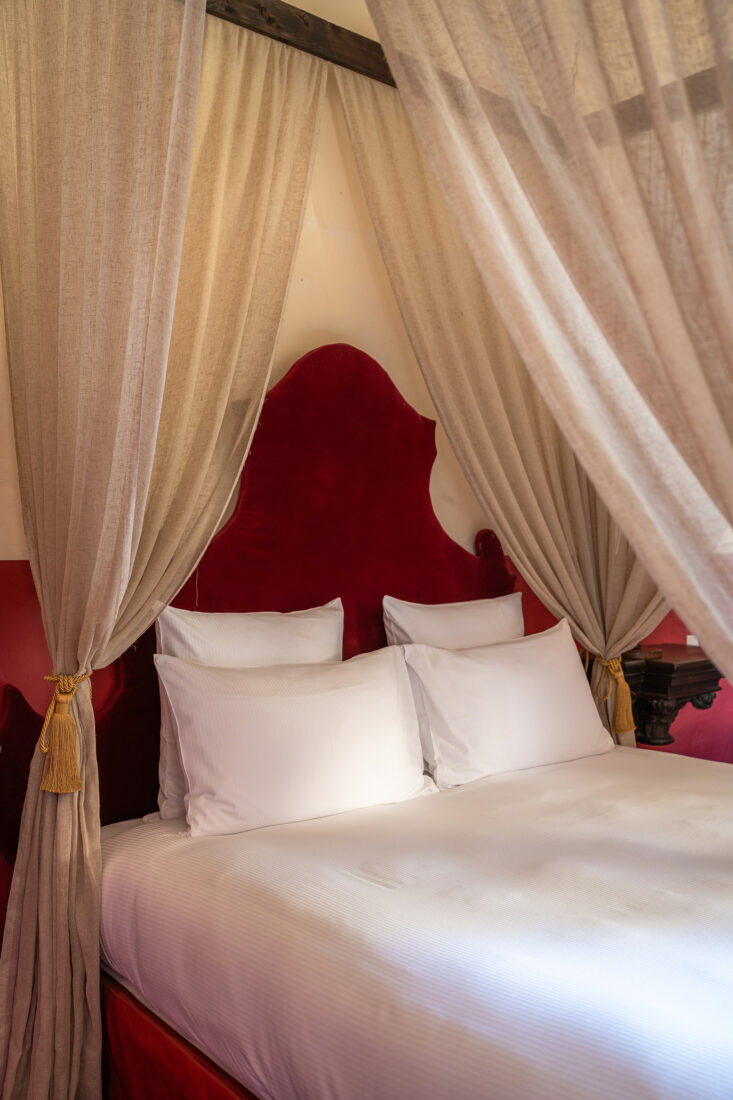 Hommage donc, l’une de nos plus belles suites devait porter ce nom et profiter du savoir-faire exceptionnel de nos artisans. Située dans une des tourelles, héritage de l’époque médiévale du château, elle a fait l’objet d’une attention particulière. Son lit à baldaquin et sa structure de 4m de haut, a été construit et cousu sur place par notre tapissière. Le rouge oriental traditionnel de ses murs a pu être restitué par notre coloriste après des recherches approfondies sur l’époque. Il permettra d’ailleurs d’y accorder la teinte des menuiseries de la fenêtre, pour sublimer et encadrer la vue qu’elle offre du parc, de ses fontaines et du taxaudier centenaire. Notre décoratrice, avec le concours d’antiquaires locaux, s’est appliquée à réunir les pièces de mobilier qui racontent et mettent en scène cette histoire jusque dans l’antichambre qui mène à ce lieu, décidément différent.